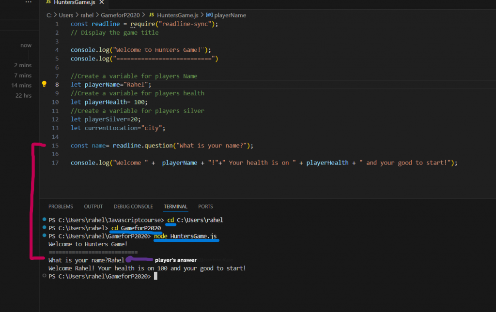 Afterwards, I would need to create and safe a JavaScript file. In order to display this file in the Terminal, I would need to navigate to the right directory. I named my file huntersGame.js, and it is located in the folder GameforP2020, which is located under User.