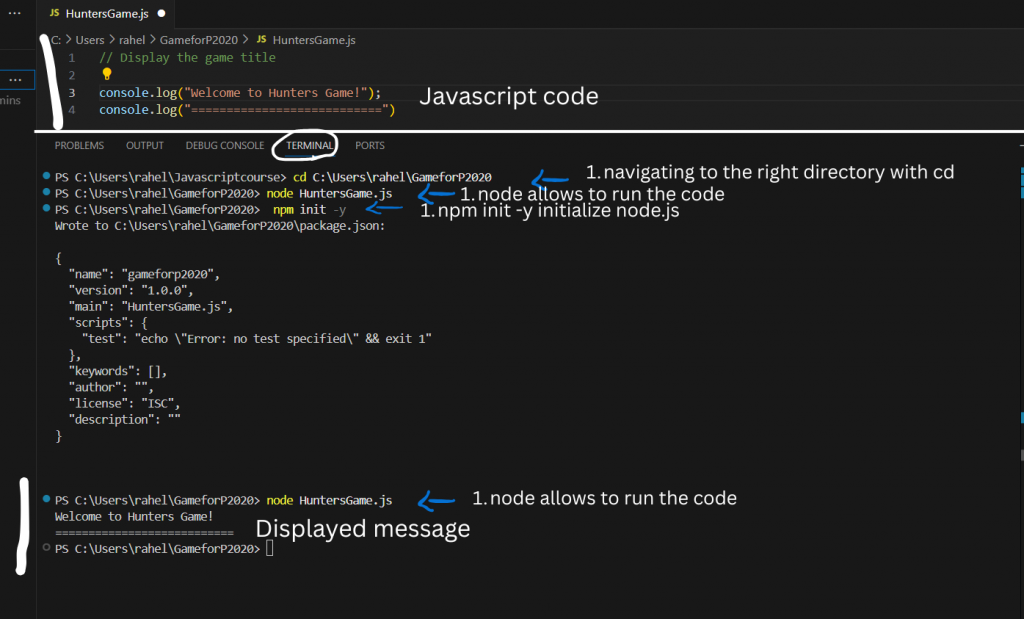 If I want to display the JavaScript code in my Terminal, I will have to enter node HuntersGame.js and this will run the code written in my file HuntersGame.js.